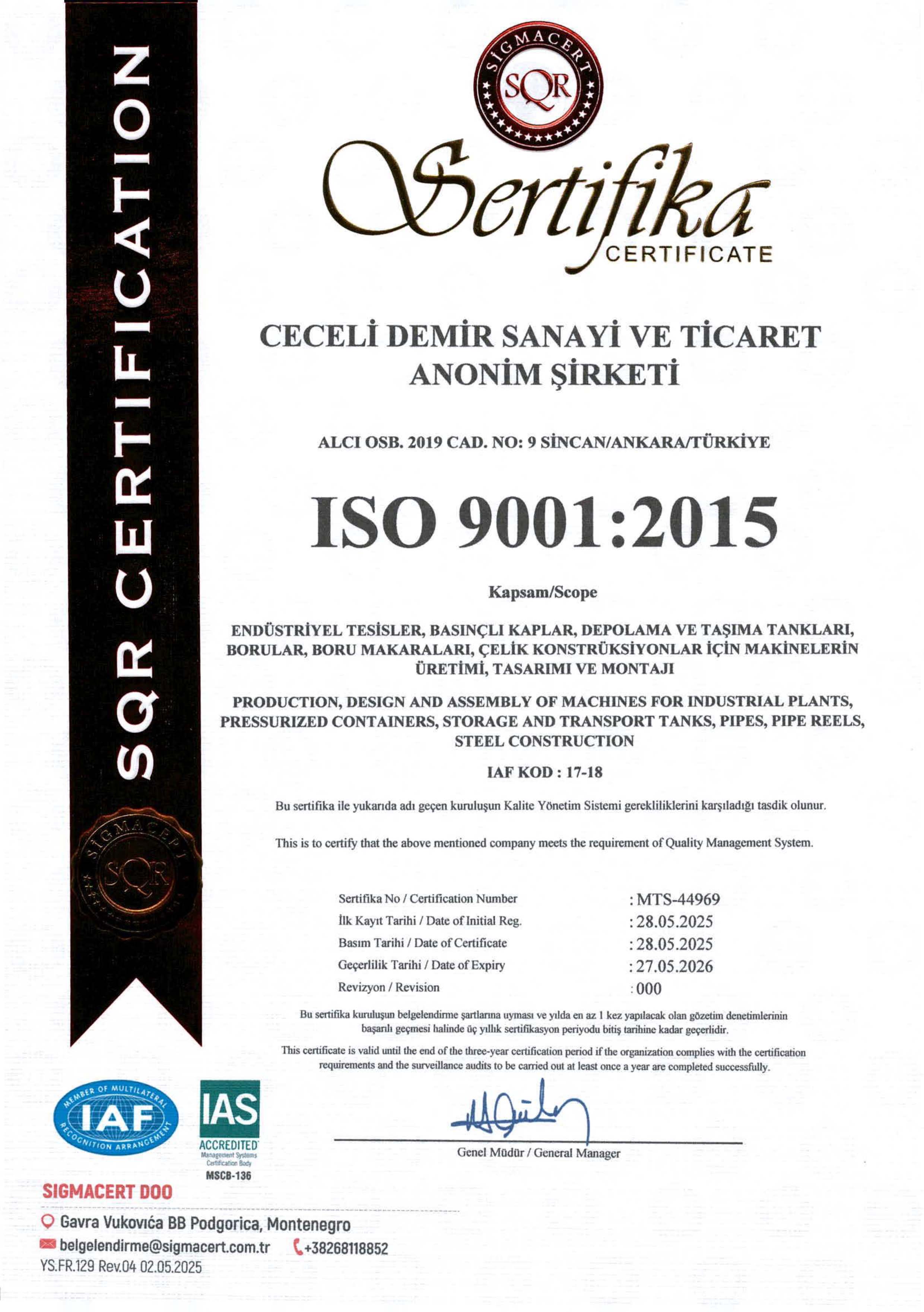 Firmamız ISO 9001 Kalite Yönetim Sistemi, ISO 14001 Çevre Yönetim Sistemi ve ISO 45001 İş Sağlığı ve Güvenliği Yönetim Sistemi belgeleri ile sahip olduğu kalite anlayışı, çevre duyarlılığı ve çalışanlarına verdiği değeri ön plana çıkardığını gösterirken EN ISO 1090-2 EXC3 Çelik Yapı Elemanları İçin Teknik Gereklilikler ve EN ISO 3834-2 Kaynaklı İmalata Yeterlilik belgeleri ile de yapmış olduğumuz kaynaklı imalatın kalitesini belgelendirmektedir.